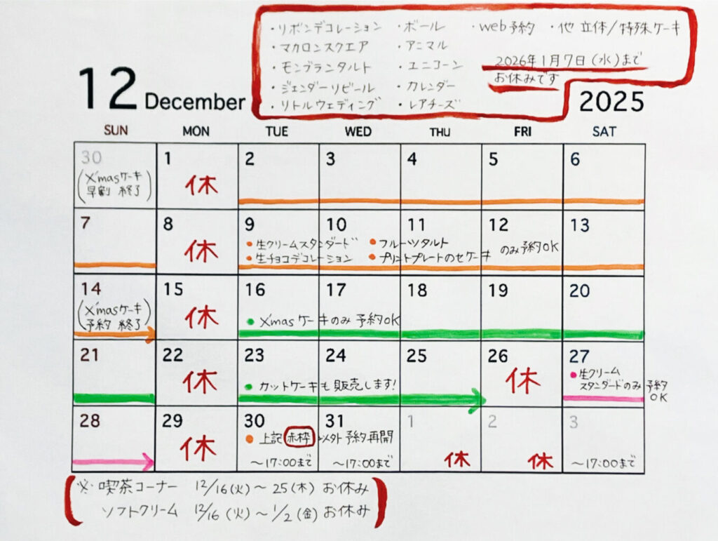 12月の定休日とデコレーション予約について
